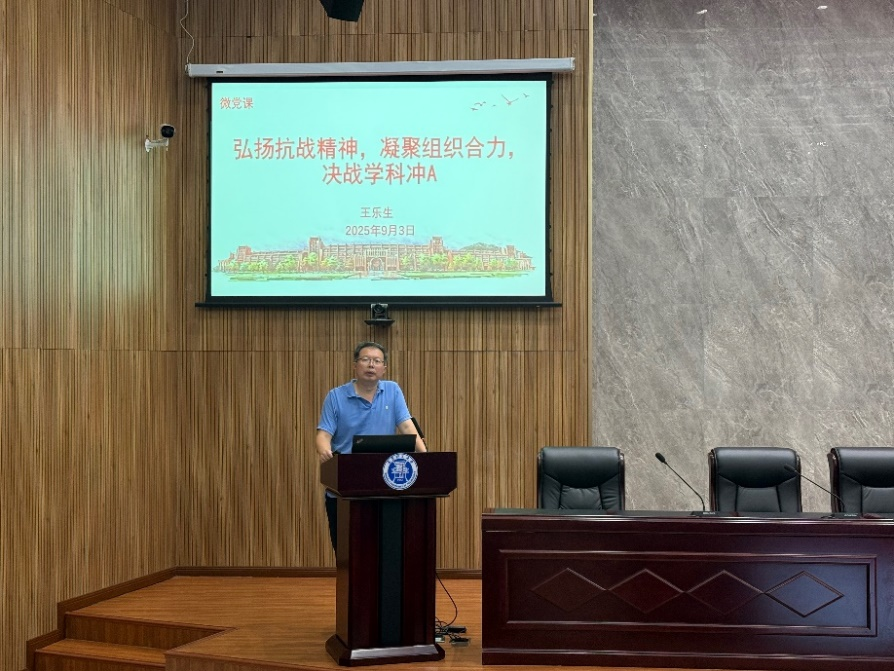 阅兵仪式结束后,学院在C2-3 G201报告厅召开全院教职工大会。学院党委书记王乐生为全体教职工带来一堂主题为《弘扬抗战精神,凝聚组织合力,决战学科冲A》的党课。他强调,抗战精神是推动学院发展的强大精神动力,决战“学科冲A”是学院当前的重要目标,需要全体教职工弘扬抗战精神,凝聚组织合力,将精神力量转化为教学科研的实际成效,以更坚定的信念、更务实的举措突破发展瓶颈,为学院高水平发展注入持久动能。