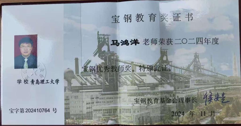 近日,2024年度宝钢教育奖评审结果揭晓,我校研究生院常务副院长马鸿洋教授荣获宝钢优秀教师奖。